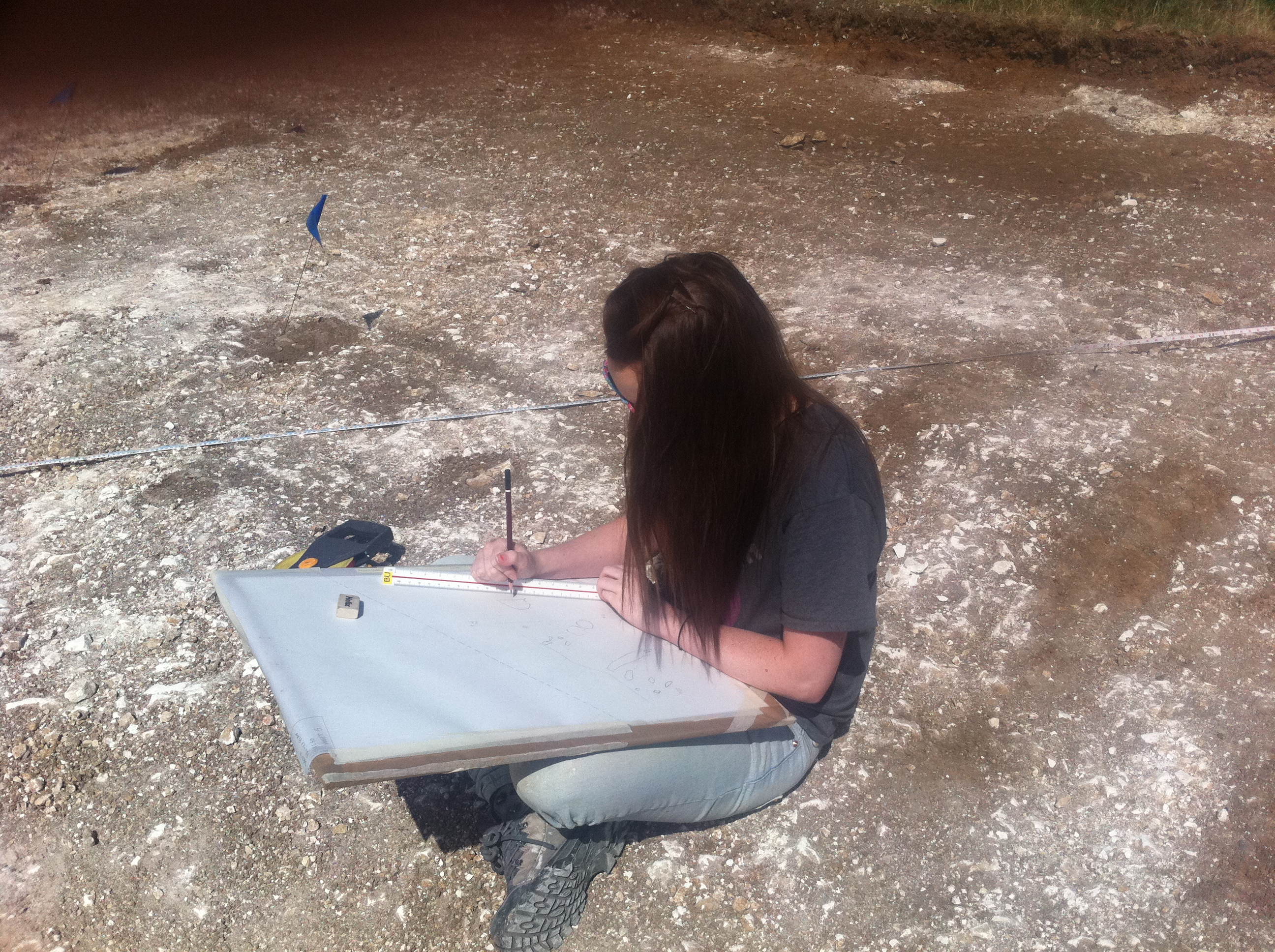 The Bronze Age food preparation area, defined by post holes with a hearth in the centre, that was discovered during the Durotriges Project 2014. A storage pit can be seen to the right.
